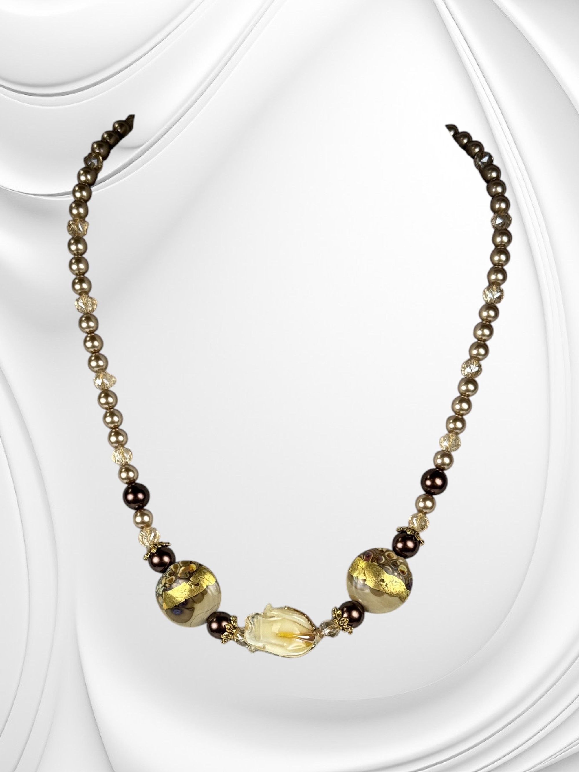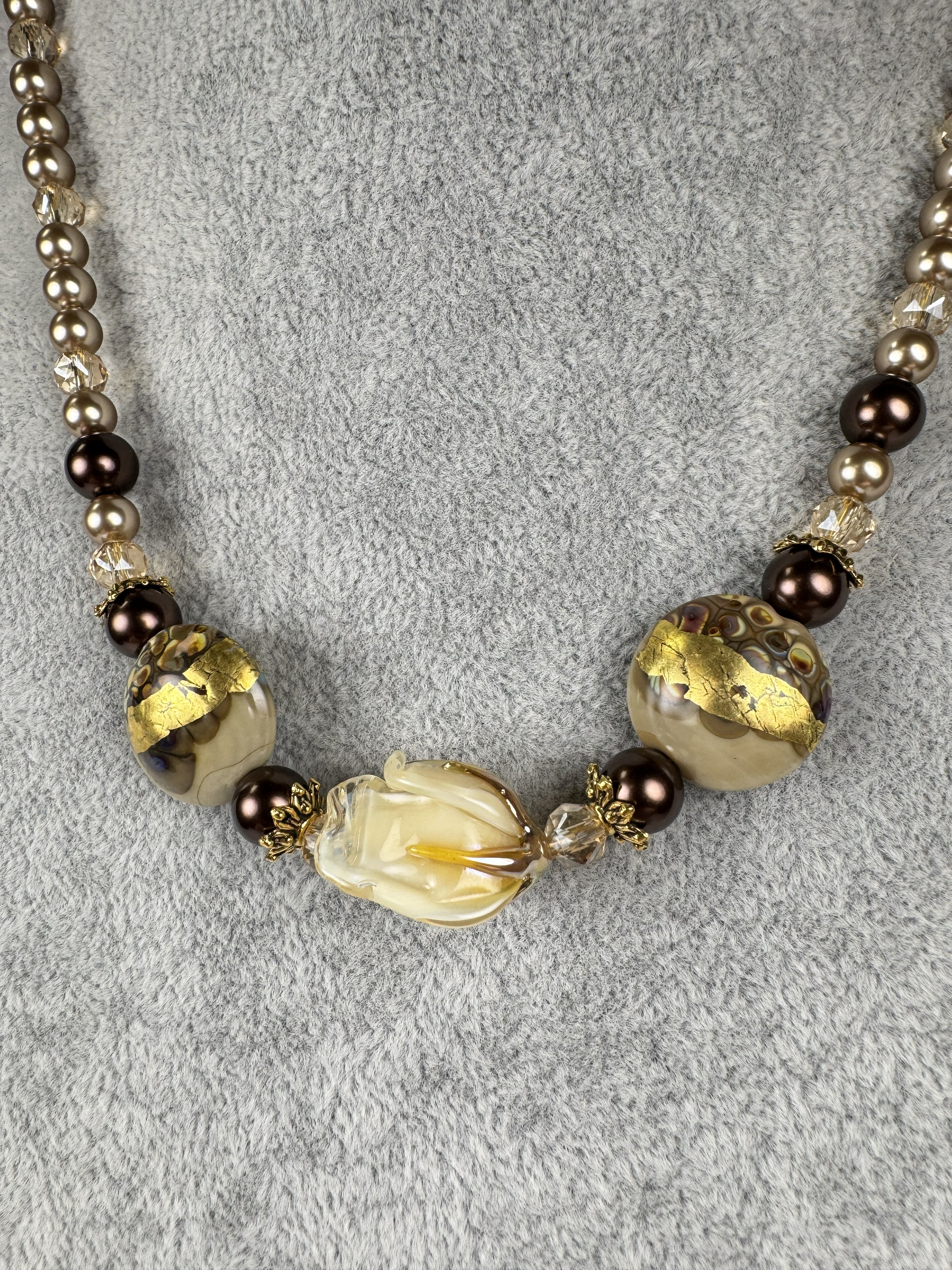 Центральным элементом колье является изящная бусина из художественного стекла с мягкими золотистыми переливами, напоминающими лепесток цветка. Её дополняют крупные авторские стеклянные элементы с декоративной золотой фольгой, которые создают глубокую игру света и придают украшению роскошный характер.