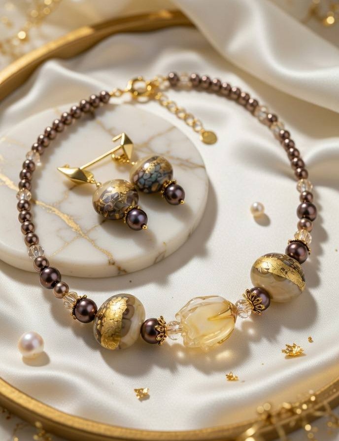 Благородная палитра оттенков — шампань, тёплое золото и глубокий шоколад — делает комплект универсальным: он одинаково гармонично смотрится как с вечерним нарядом, так и с элегантным повседневным образом.