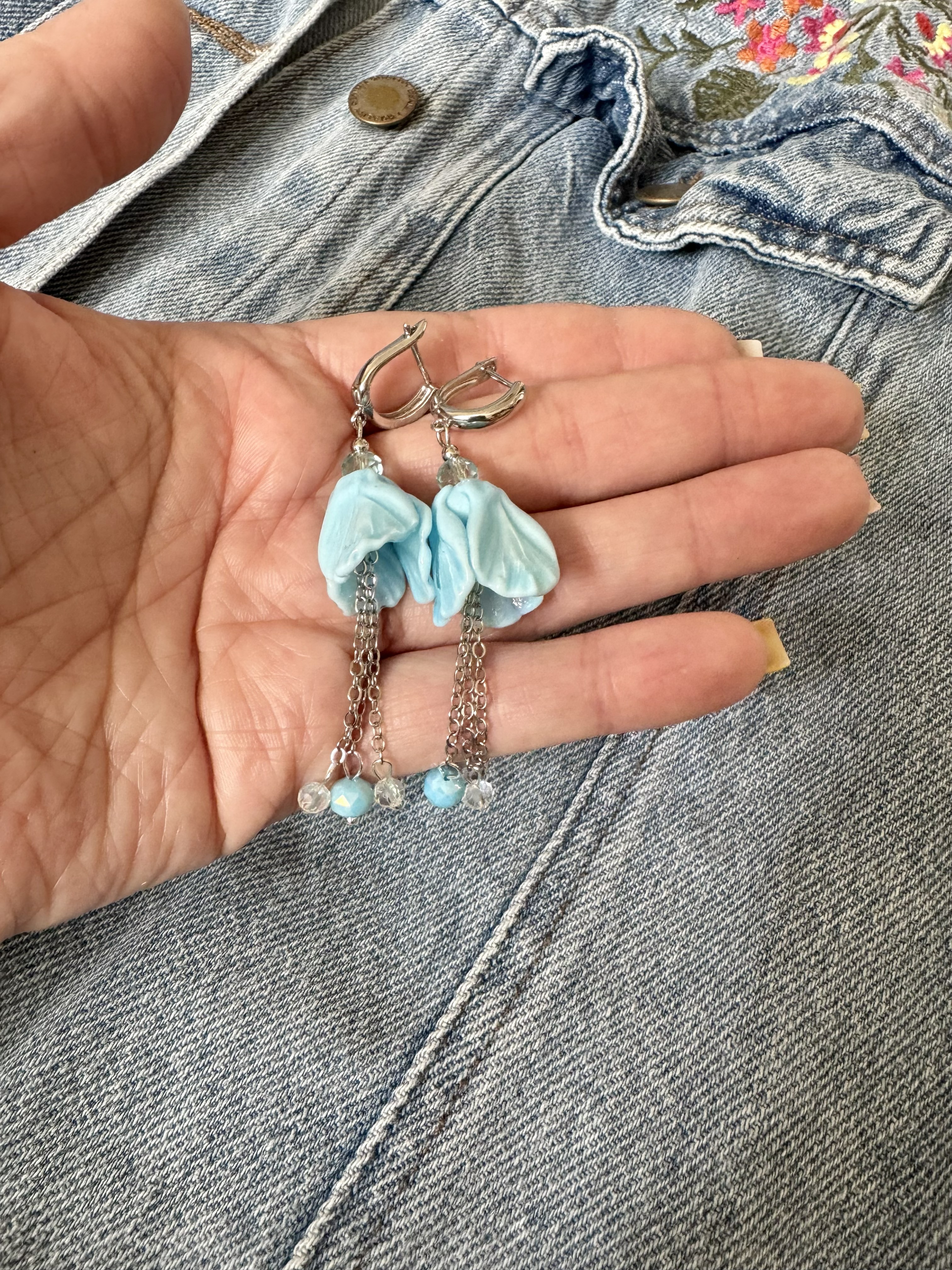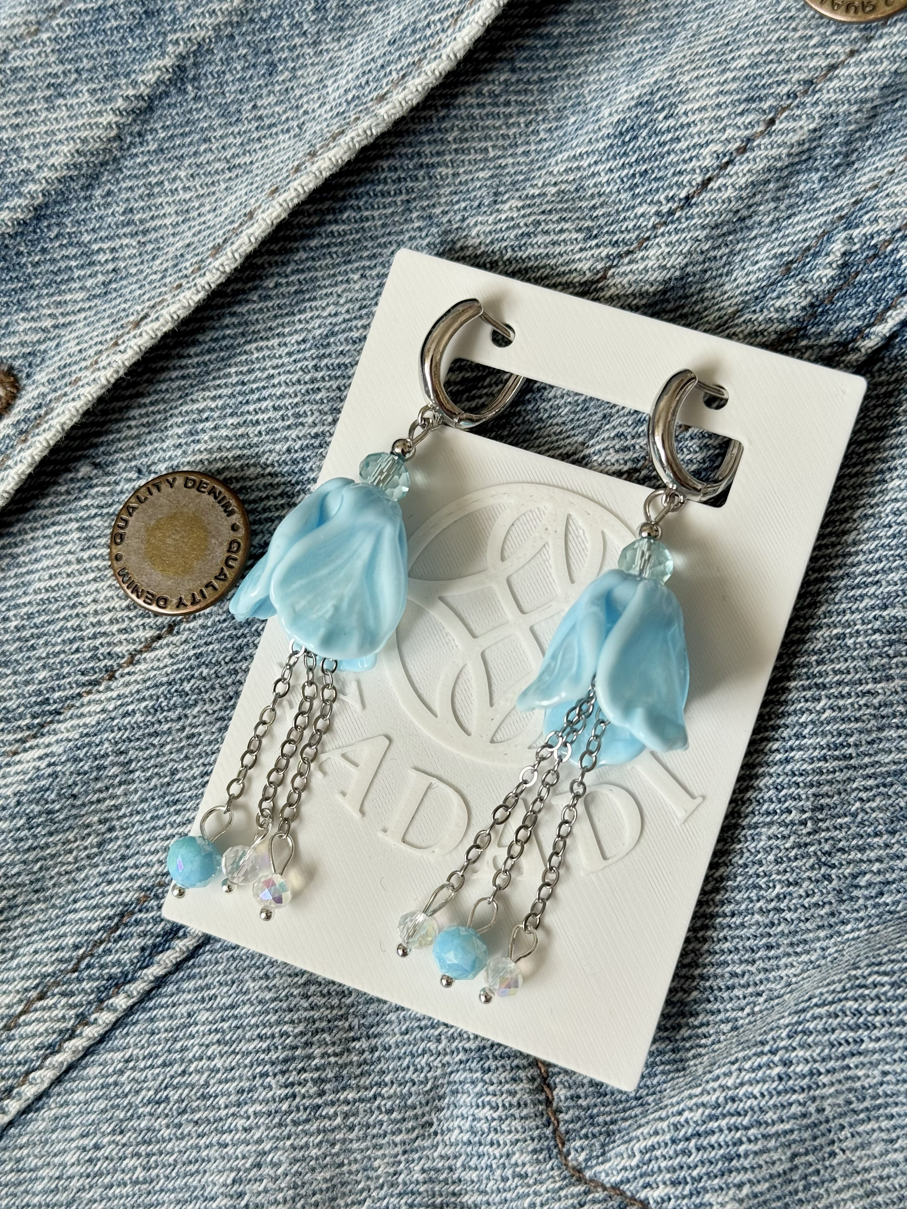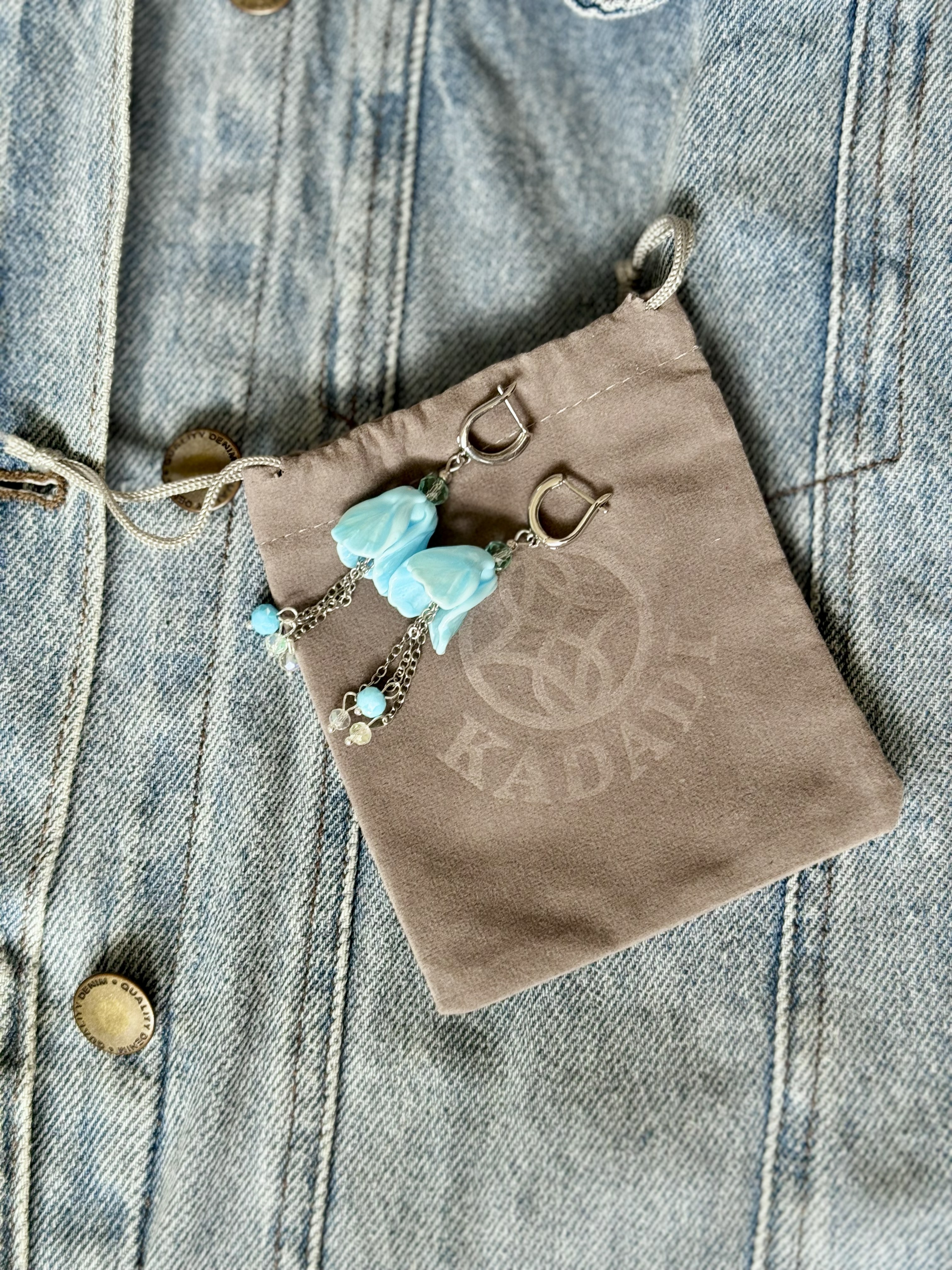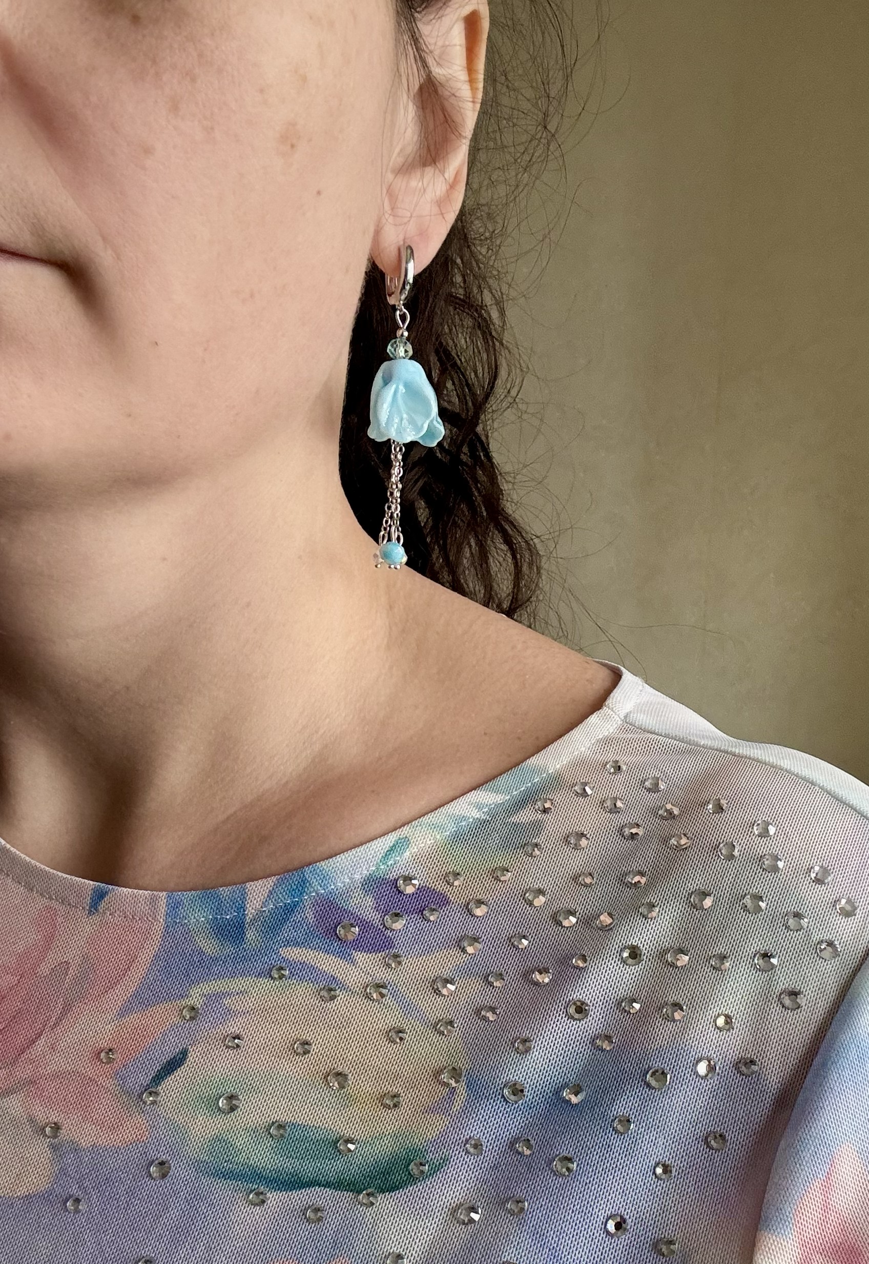 Эти серьги — не просто украшение, а маленькое произведение искусства. Каждый голубой лепесток выполнен вручную в технике лэмпворк: стекло плавится в огне и превращается в уникальную форму, поэтому двух абсолютно одинаковых изделий не существует.