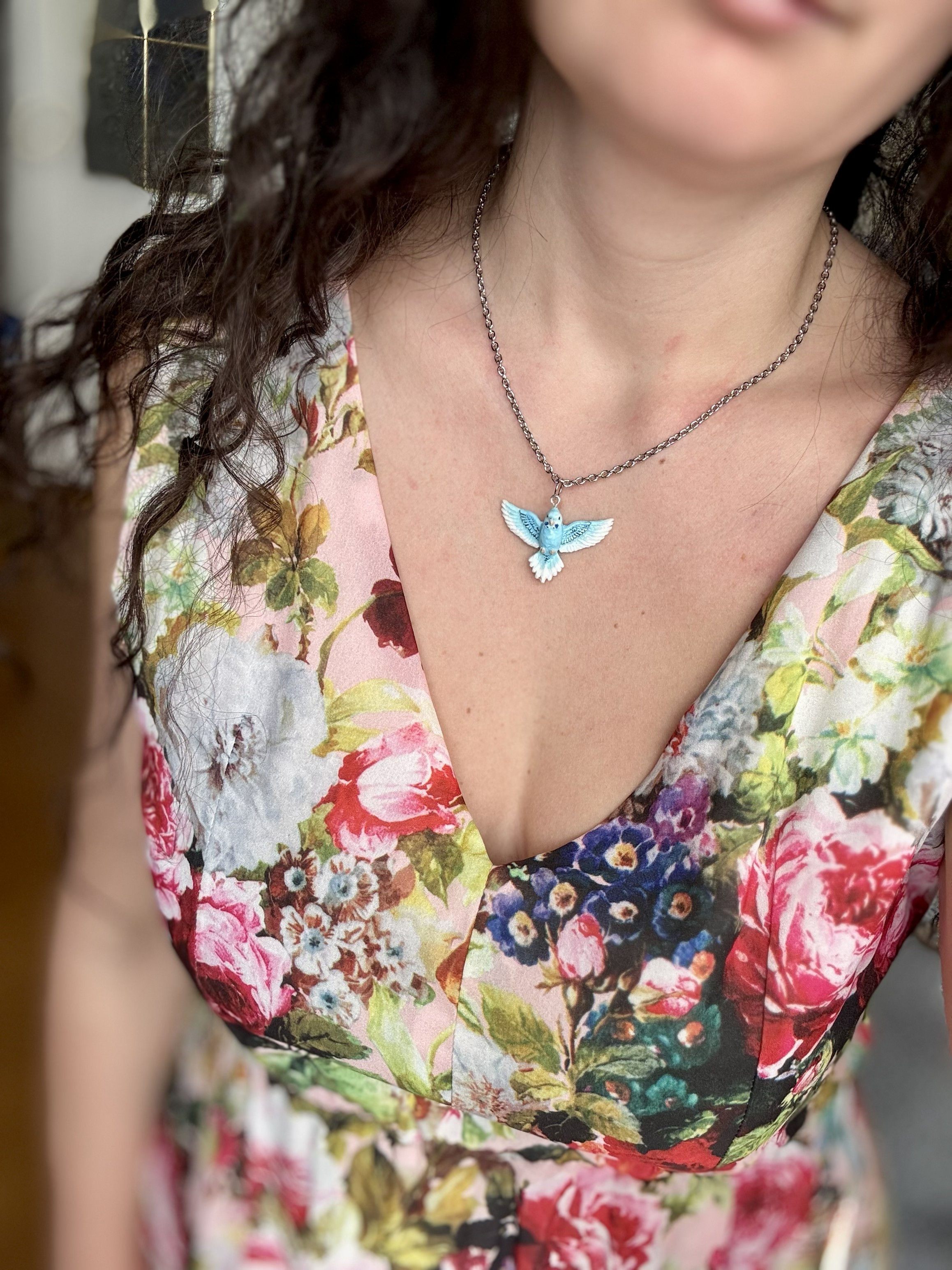 Этот кулон словно поймал мгновение свободы: попугай с распахнутыми крыльями в небесно-голубых оттенках передаёт чувство свежести, воздуха и внутренней лёгкости. Он не просто украшение — это акцент, который делает образ более живым и утончённым.
