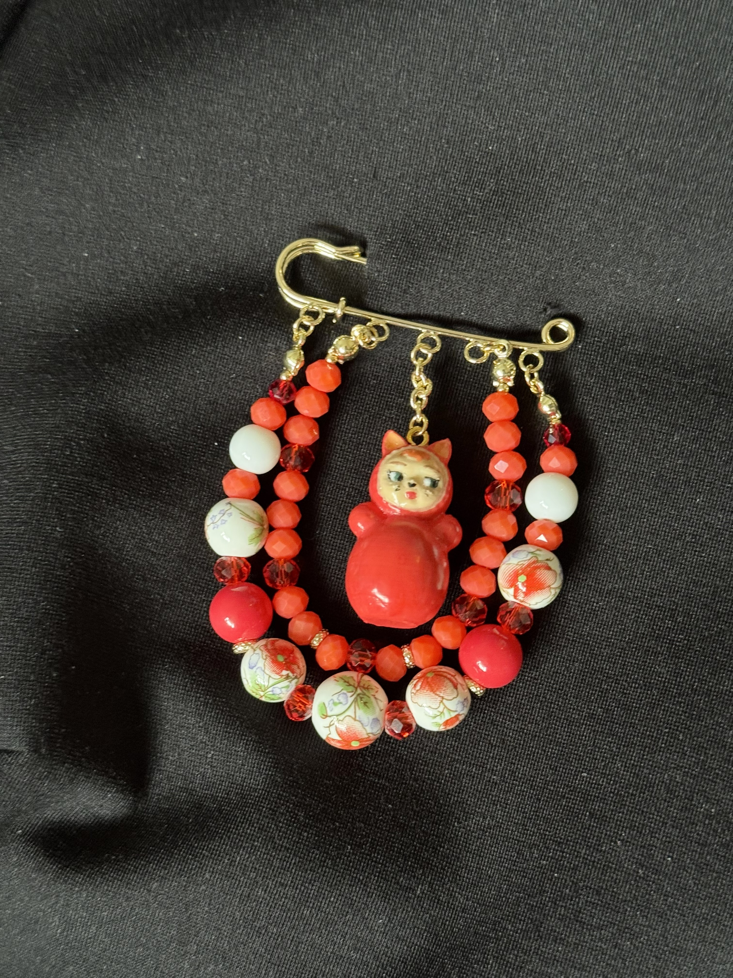 В центре — неваляшка-кошка в сочных коралловых оттенках. Она словно балансирует между игрой и характером: немного капризная, чуть дерзкая, но неизменно обаятельная. Её образ собран из керамических деталей с выразительной фактурой и дополнен чешским хрусталем, который вспыхивает мягкими бликами при каждом движении, как искры света в тёплом воздухе.