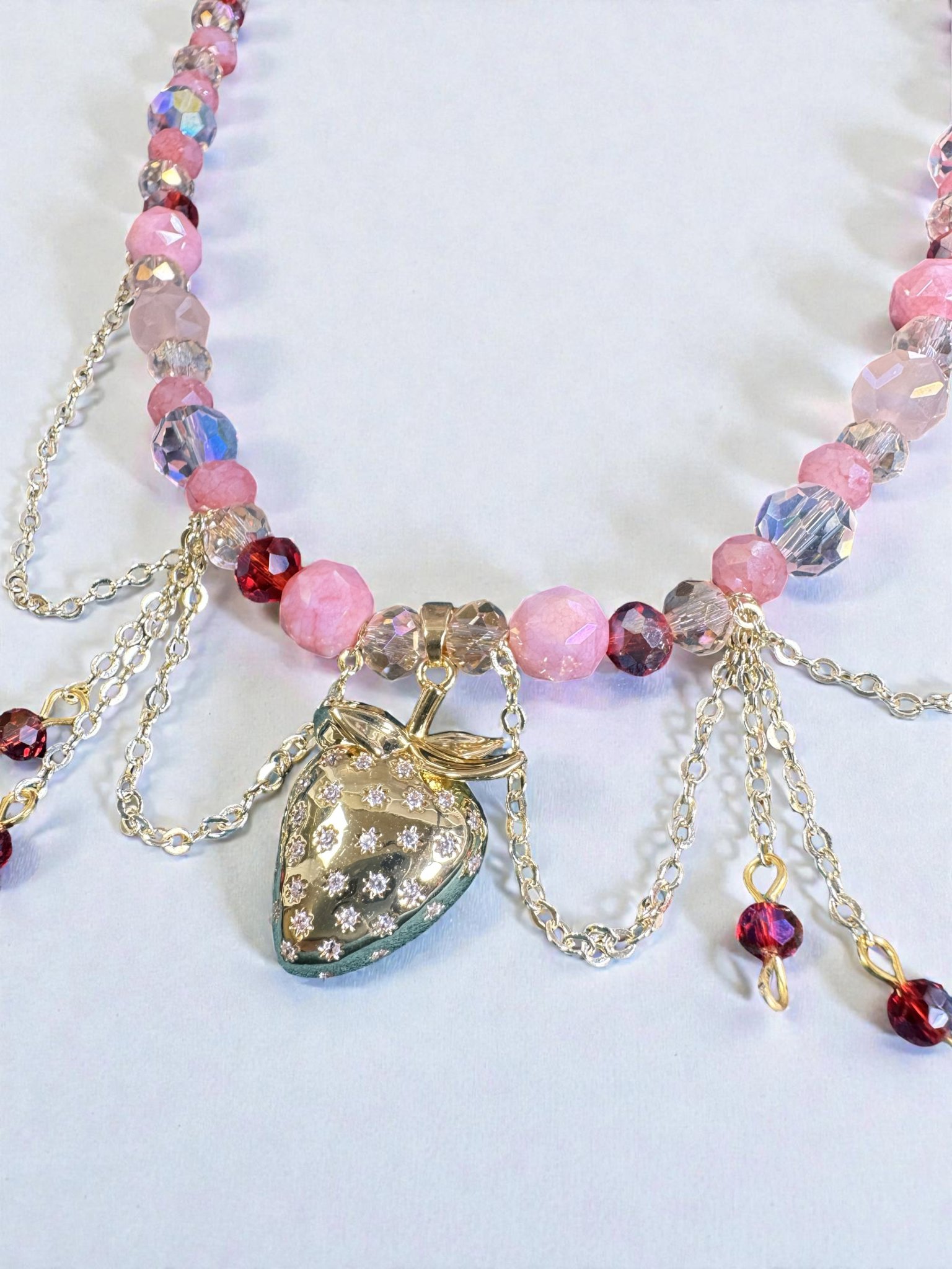 Чокер с чешским хрусталём в нежных розово-пудровых оттенках и подвеской в виде клубники — словно маленькая история из волшебного сада.