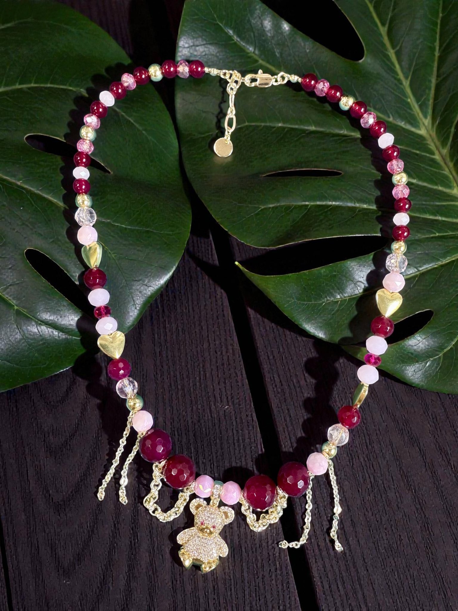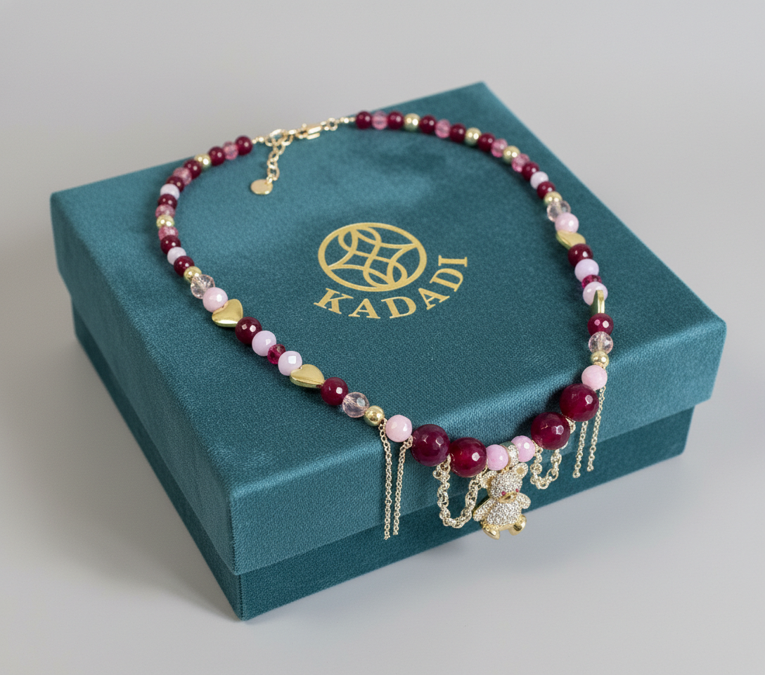 Глубокий бордовый халцедон придаёт образу благородство и уверенность, розовый и прозрачный чешский хрусталь добавляет мягкое сияние и романтичный блеск, а золотистый гематит завершает композицию тёплым акцентом роскоши.