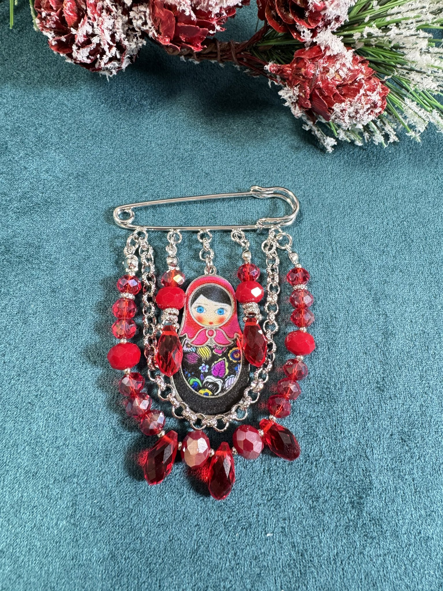 Яркая матрёшка в центре композиции словно хранит тепло, уют и добрые воспоминания, а насыщенно-красный чешский хрусталь красиво ловит свет и мягко переливается при каждом движении.